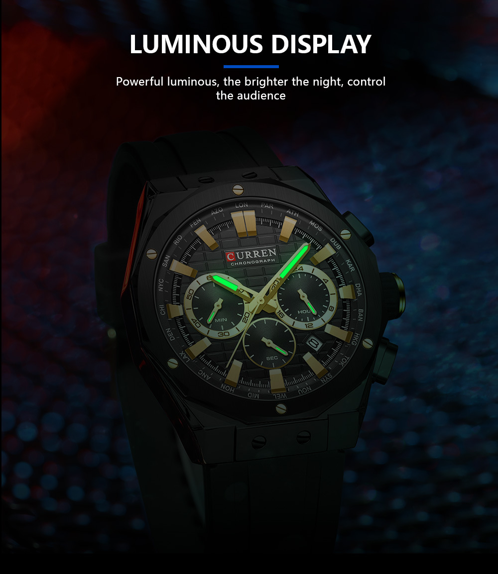 Het CURREN herenhorloge heeft een strak, modern design met een comfortabele siliconen band die zich perfect aanpast aan uw pols, zodat u het de hele dag kunt dragen. De waterdichte kast beschermt het nauwkeurige quartz chronograafmechanisme, terwijl de lichtgevende wijzers de zichtbaarheid bij weinig licht verbeteren. Dit horloge combineert luxe met functionaliteit en is een veelzijdig accessoire voor elke gelegenheid.
