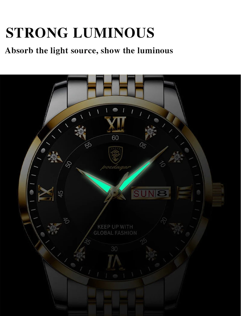 The POEDAGAR Korean Style Luxury Men Quartz Watch features luminous hands and markers, allowing you to easily read the time even in low-light conditions. This practical feature enhances usability without sacrificing the watch’s sleek and sophisticated design. Combined with its waterproof stainless steel build and convenient week and date displays, this watch offers both style and functionality for everyday wear.